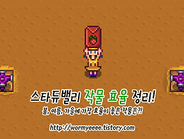 | 스타듀밸리:: 봄, 여름, 가을 작물 효율 정리! (8) | 2017.01.07 |